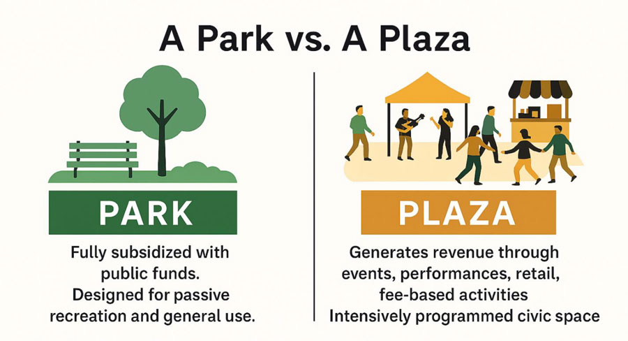 The plaza is being planned as a long-term investment in downtown vibrancy. Funding may include: